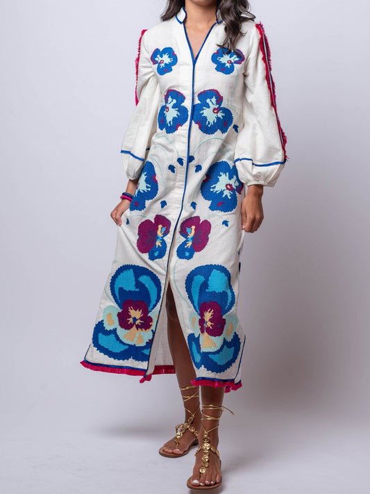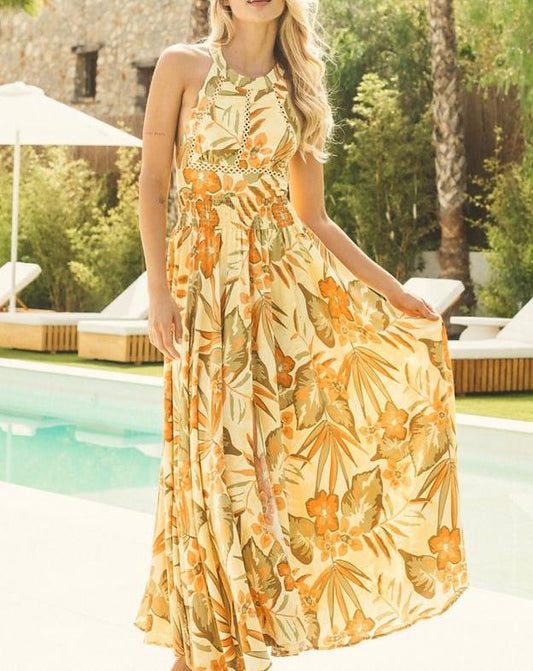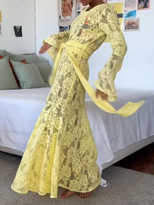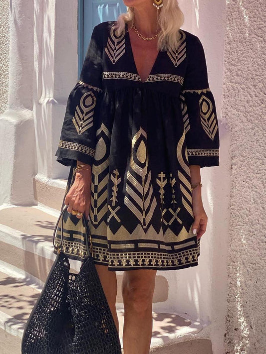 V Neck Long Sleeve Lace Up Printed Slit Dress
