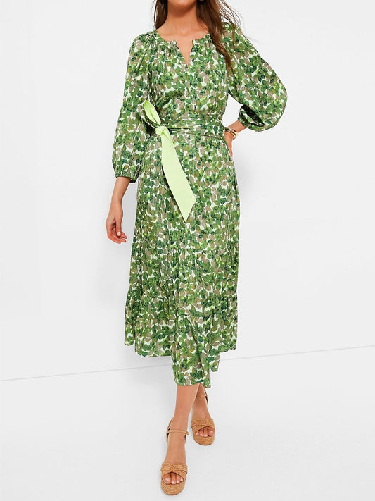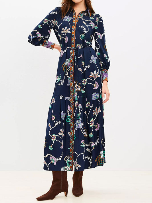 Printed Button Up Long Sleeve Tie Waist Maxi Dress