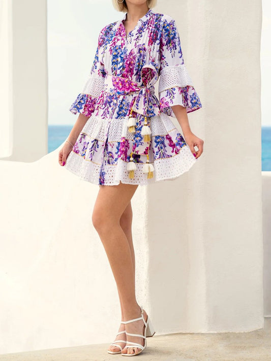 Embroidered Printed V Neck Tie Up Dress