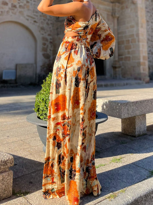 Skew Neck Printed Long Sleeve Party Dress