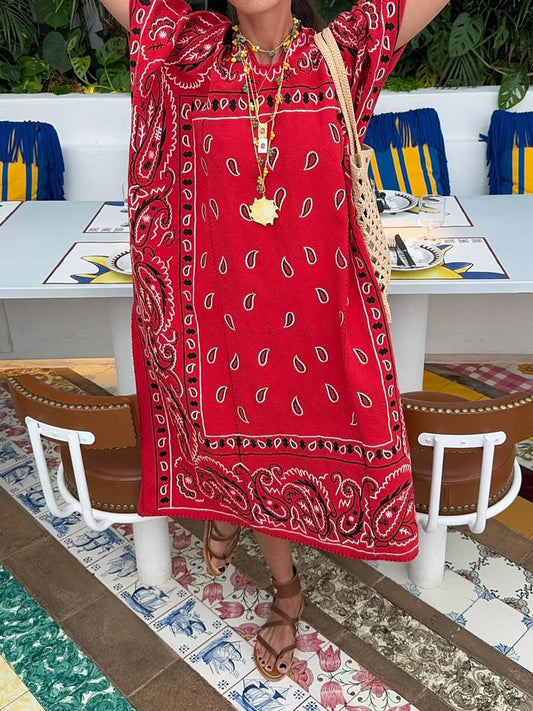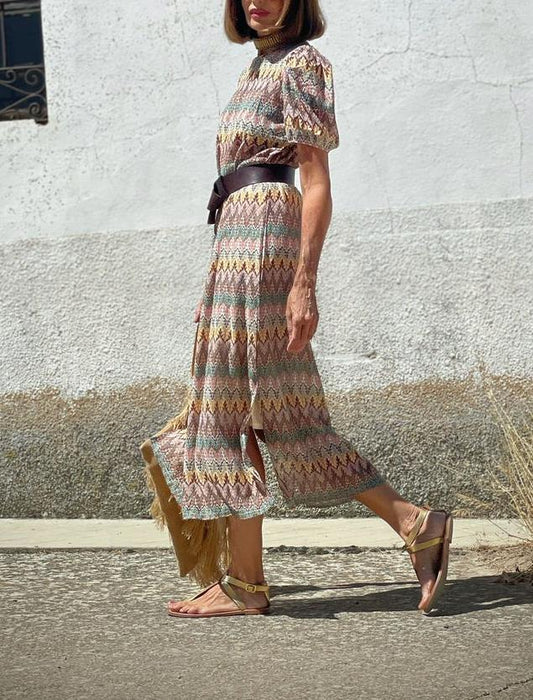Loose Long Sleeve Color Block Side Split V Neck Maxi Dress