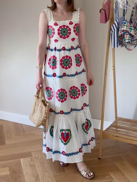 Printed Embroidered Square Collar Dress